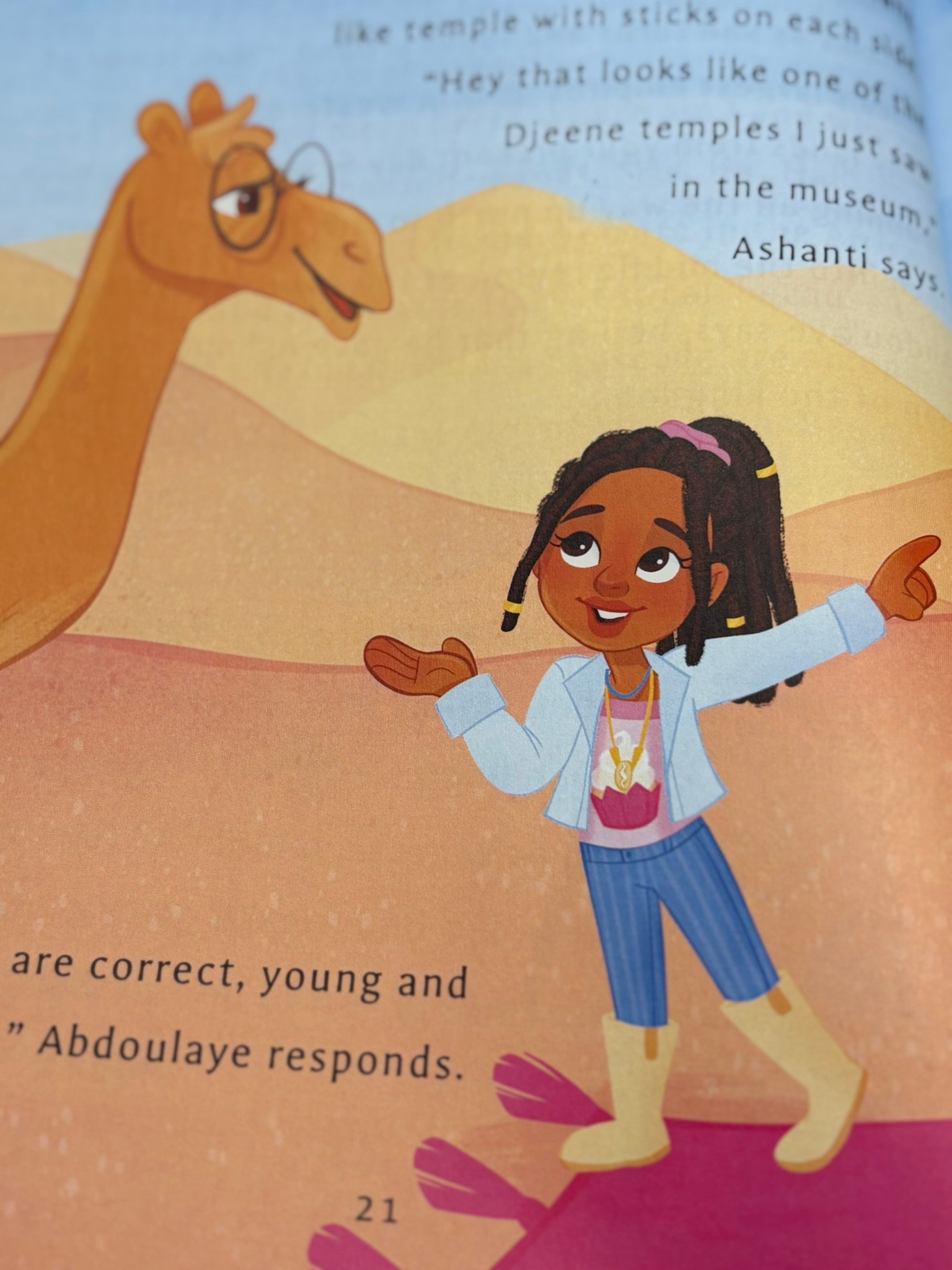 Ashanti travels to one of East Africa’s oldest civilizations. While she is there, she meets a beautiful princess named Aida and Maaza, the talking giraffe. Aida shares so much history and culture with Ashanti and promises to introduce Ashanti to the royal family. Before Ashanti knows it, she is back home telling Kamari about her adventure.